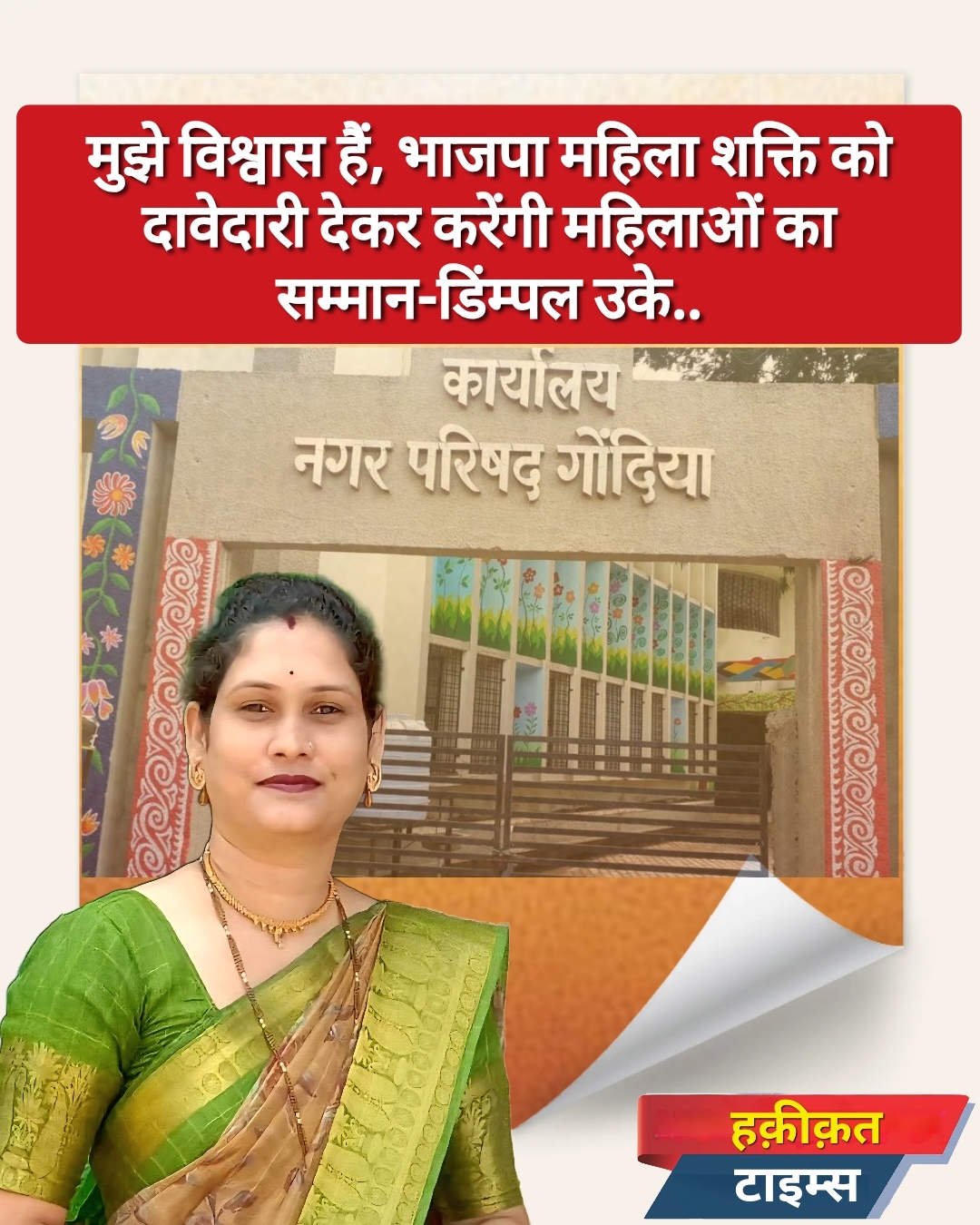 गोंदिया। भाजपा में सक्रिय महिला कार्यकर्ता एवं ओबीसी संगठन में अनेक वर्षों से जुड़कर उसके माध्यम से ओबीसी समाज के हक और अधिकार के लिए आवाज बुलंद कर रही छोटा गोंदिया क्षेत्र की डिंम्पल तीर्थराज उके ने आगामी दिनों में होने जा रहे गोंदिया नगर परिषद नगराध्यक्ष पद हेतु भाजपा से अपनी उम्मीदवारी की दावेदारी की है।