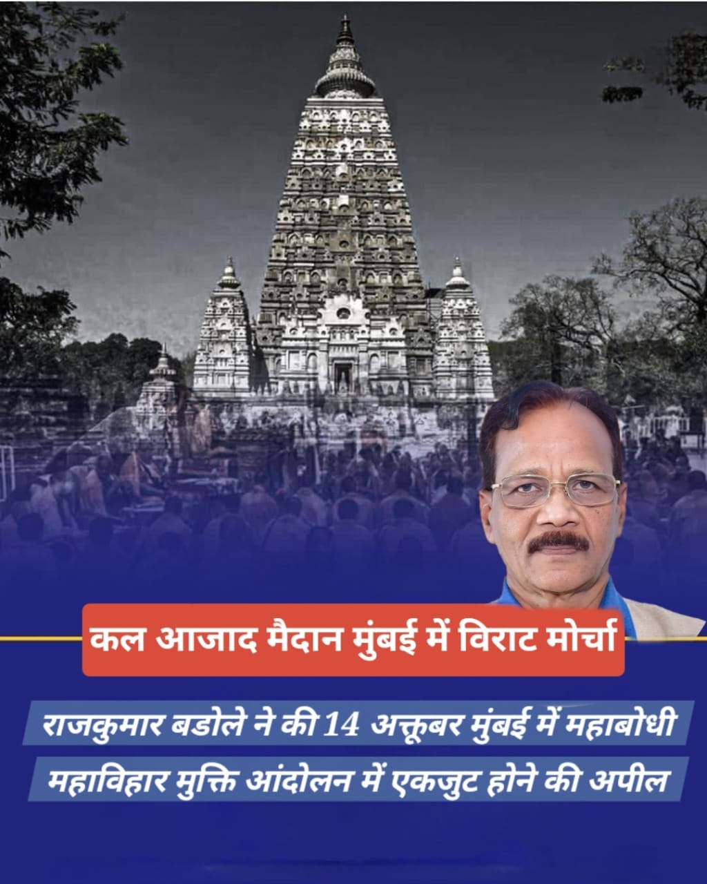 महाबोधि महाविहार मुक्ति के लिए कल मुंबई के विराट मोर्चे में एकजुट होने के लिए राज्य के पूर्व सामाजिक न्याय मंत्री एवं वर्तमान विधायक राजकुमार बडोले फाउंडेशन द्वारा सभी बौद्ध अनुयायियों से आव्हान किया गया है कि वे इस विराट मोर्चे में अपनी सहभागिता दर्शाकर महाबोधी महाविहार मुक्ति आंदोलन का हिस्सा बनें।