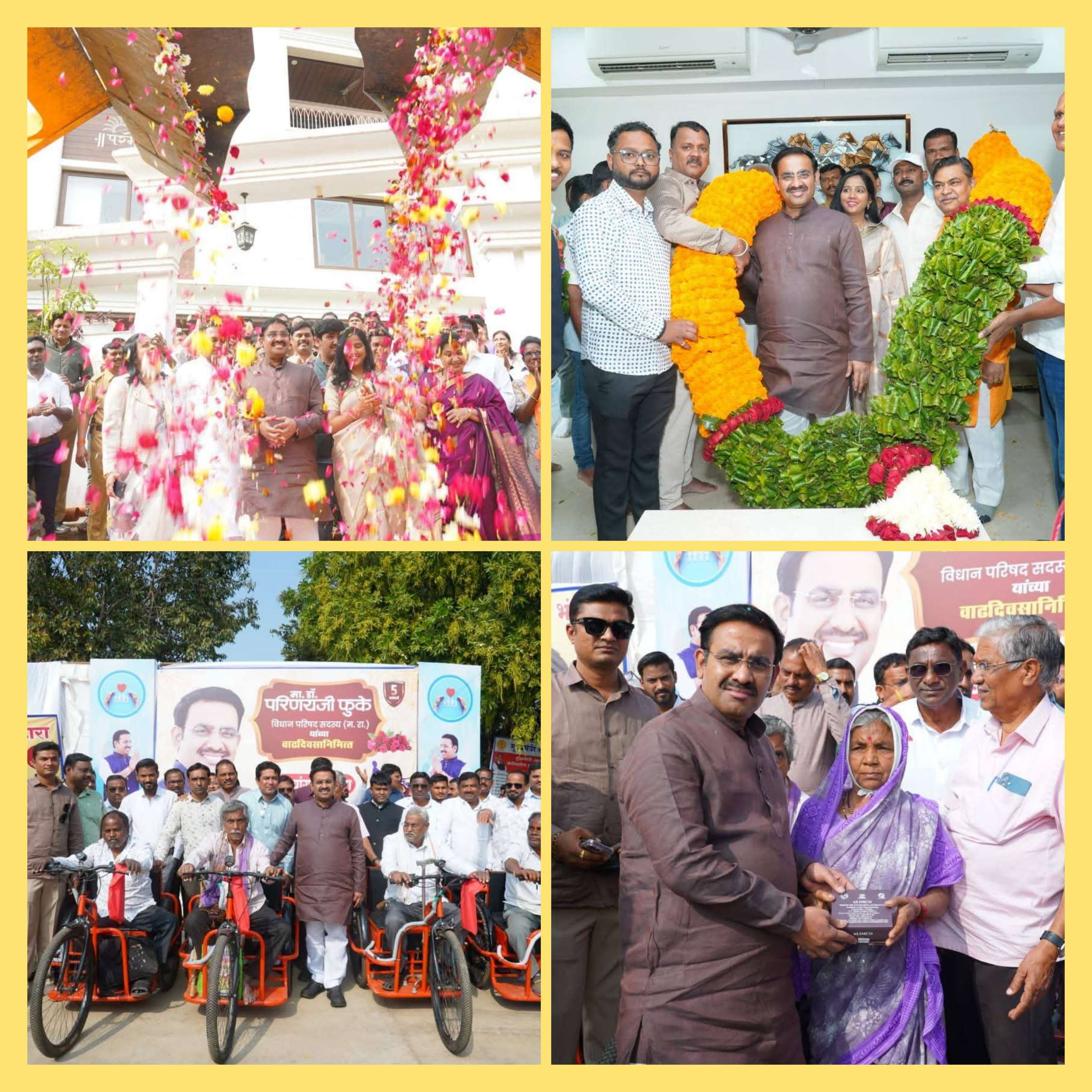 नागपुर निवास हिलटॉप में क्रेन जेसीबी मशीन से समर्थकों ने अपने नेता डॉ. परिणय फुके पर फूलों की वर्षा कर अपनापन दिखाया वहीं गोंदिया, भंडारा और लाखनी में स्वास्थ्य जांच शिविर, रक्तदान शिविर, दिव्यांगों को ट्राइसिकल, कर्ण बधिर को मशीन, मरीजों को कंबल वितरित कर अपने नेता की दीर्घ आयु की कामना की।