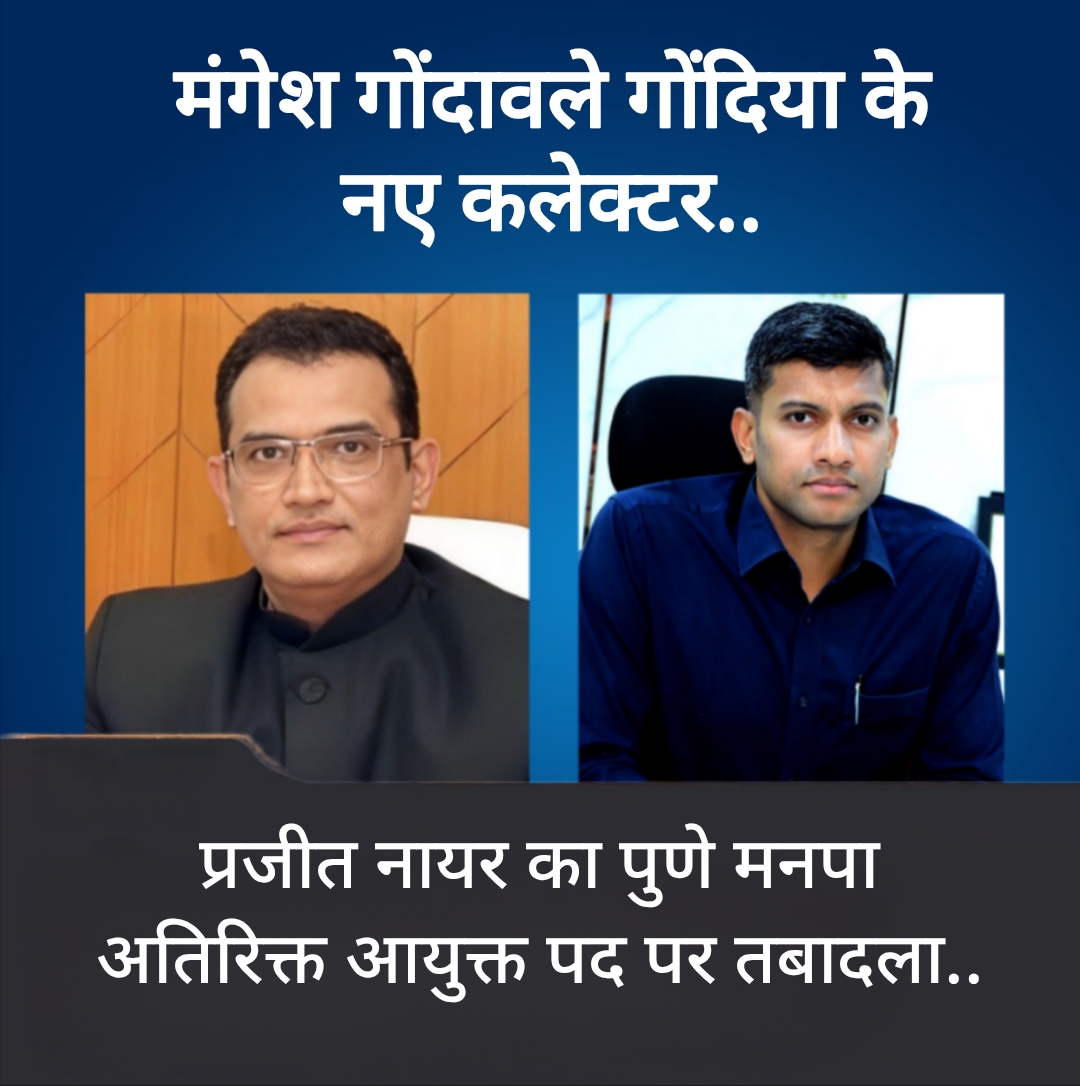 गोंदिया। सामान्य प्रशासन विभाग मंत्रालय मुंबई द्वारा आज 2 अप्रैल को आदेश जारी गोंदिया के जिलाधिकारी प्रजीत नायर का पुणे महानगर पालिका में अतिरिक्त आयुक्त पद पर तबादला किया गया है। अब नायर की जगह महाराष्ट्र औद्योगिक कृषी विकास महामंडळ के व्ययस्थापकीय संचालक भाप्रसे के अधिकारी श्री मंगेश गोंदावले को गोंदिया जिल्हाधिकारी के पद पर नियुक्त किया गया है।